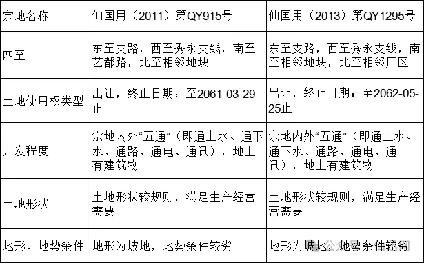 4、权属:标的物已取得《房屋所有权证》及《国有土地使用证》,标的物两块宗地相连,位于同一厂区,地上建有产权建筑5幢及厂区宗地红线范围内附属配套设施工程(包括门卫室、蓄水池、配电室、护坡、围墙、其它未确权建筑、路面硬化、绿化、管网、厂区供水供电设施等)。