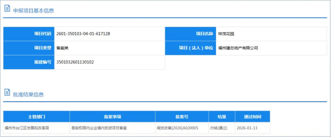 1月13日,来自福建省投资项目在线审批监管平台消息,由福州建总地产有限公司开发的祥茂花园项目备案已获通过,主管部门为福州市台江区发展和改革局。
