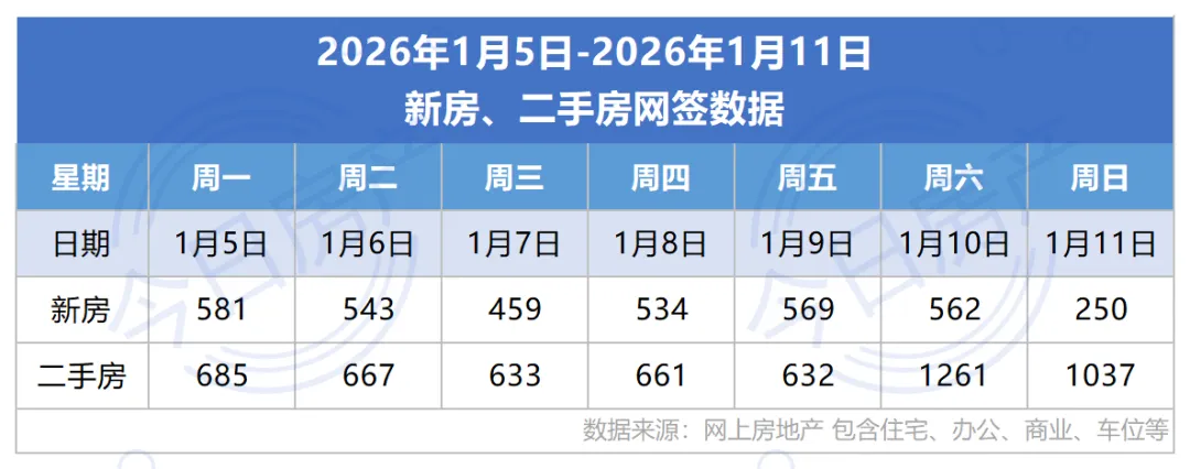 上周(1.5—1.11)新房网签3498套,环比下跌约46.6%;成交面积5.71万平方米,环比减少54.46%。