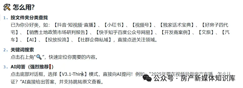 这不是一个普通的资料库,而是房产新媒体领域【首个】专属AI专家库,更是你身边有问必答的房产行业智能助手!