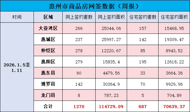 大亚湾区网签266套,面积25044.06㎡;惠城区237套,25997.27㎡;仲恺区278套,12220.67㎡;惠阳区279套,15835.4㎡;惠东县60套,4479.56㎡;博罗县142套,30364.9㎡;龙门县8套,787.23㎡。合计1270套,114729.09㎡。