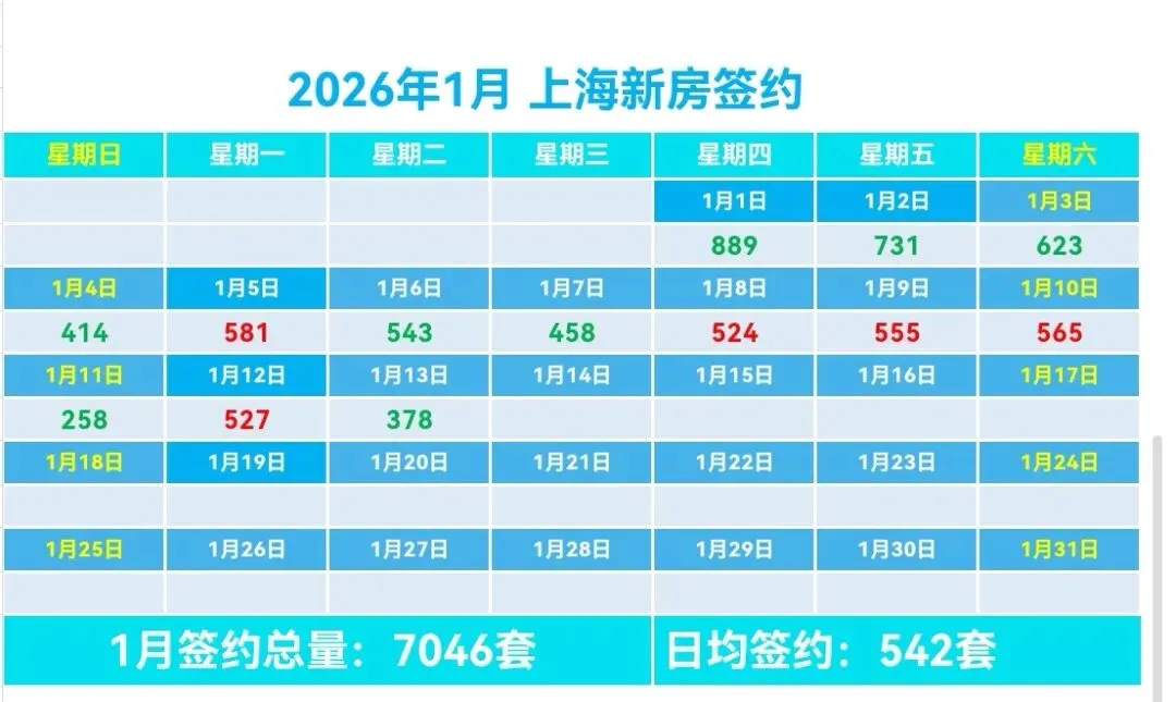 🏠1月上海新房总签约7046套,日均签约542套,本月签约总面积44.41万m²,套均面积65.83m²。