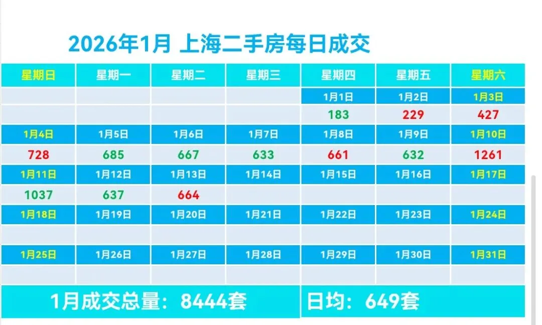 🏡1月,上海二手房成交量累计8444套,日均成交649套,较上个月日均减少91套(降幅12.3%)。