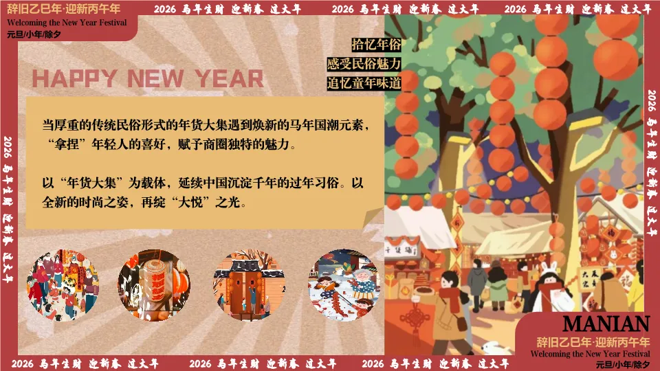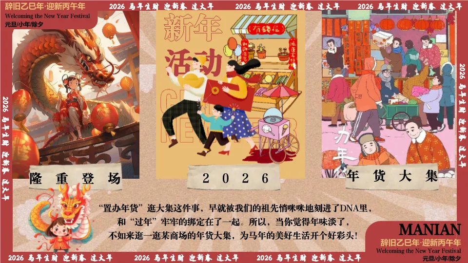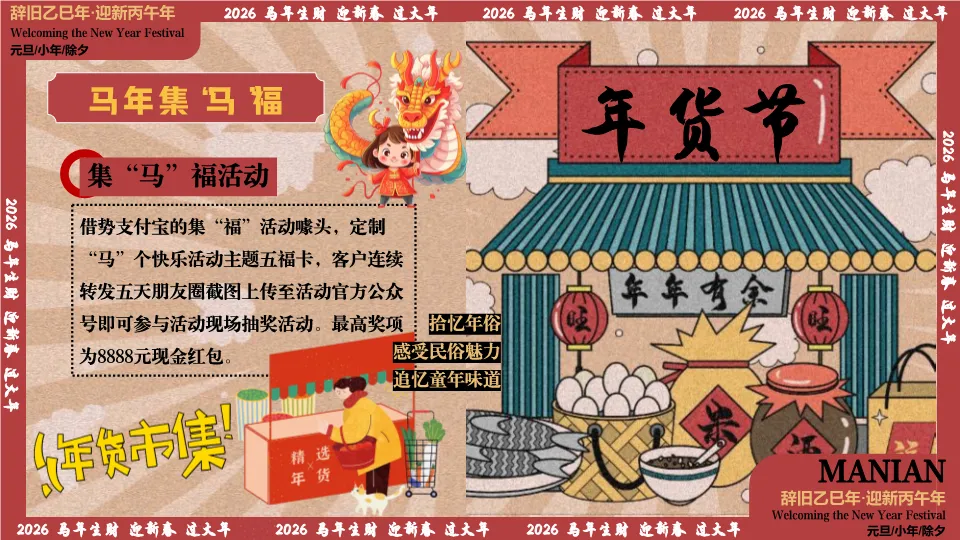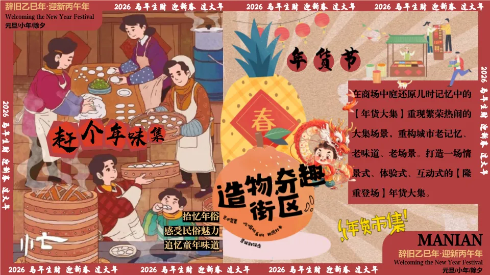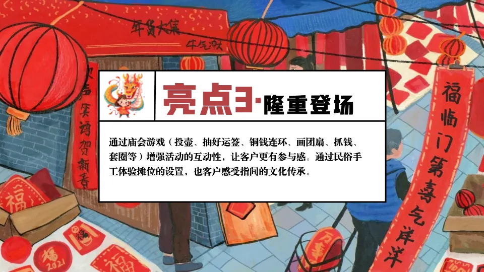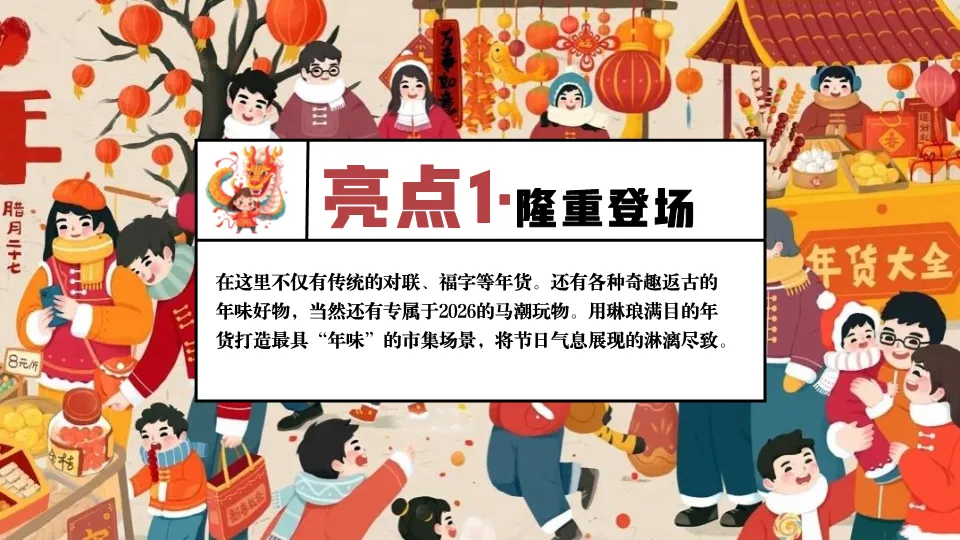 此外,现场还规划了新年上上签、祈福许愿、年味互动打卡(如老式爆米花、二八自行车场景)等主题区域,并辅以灯笼装饰、仿古摊位设计,全方位营造节日氛围。