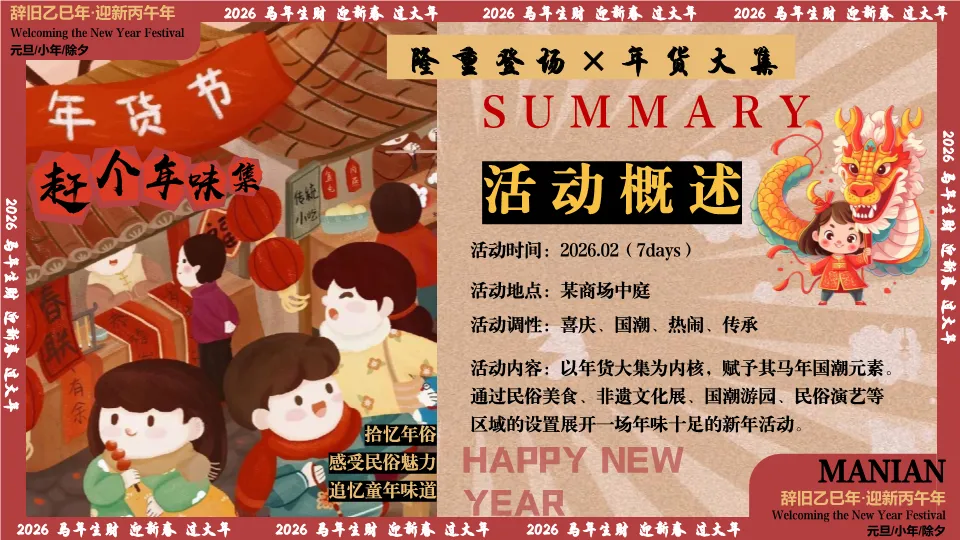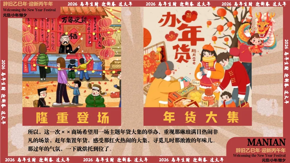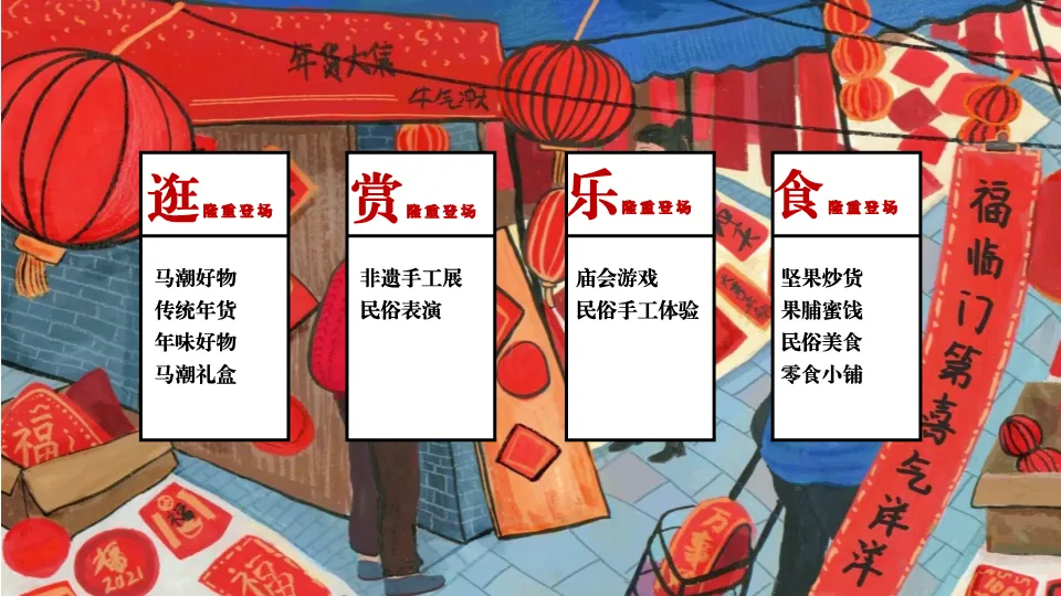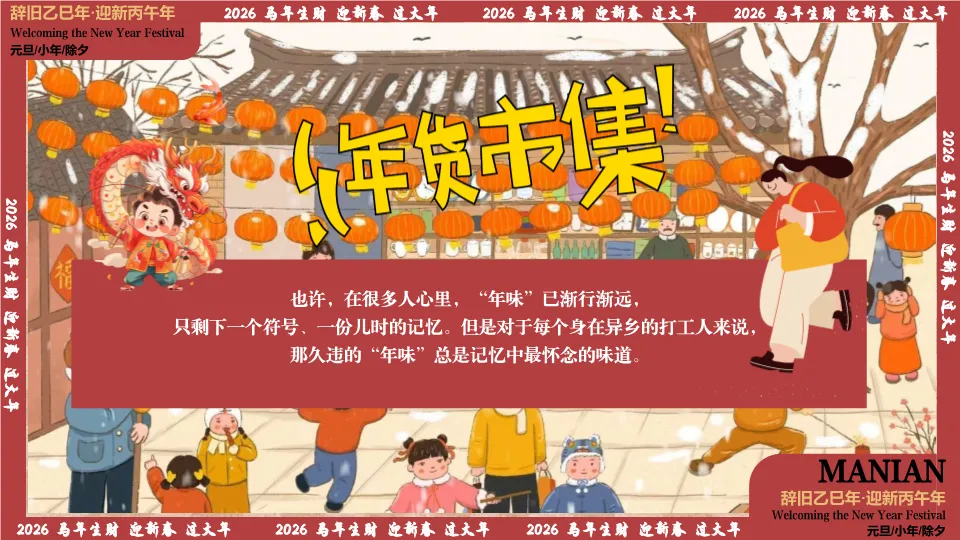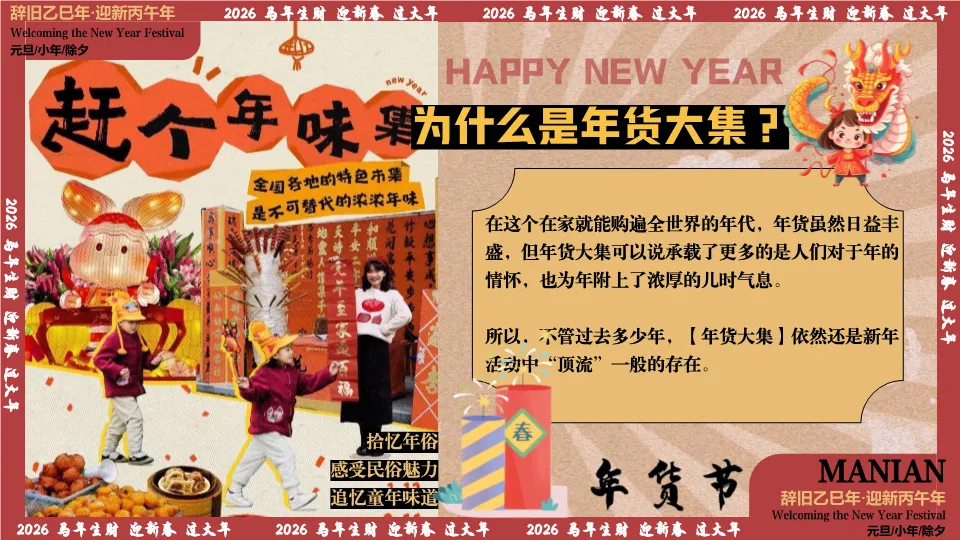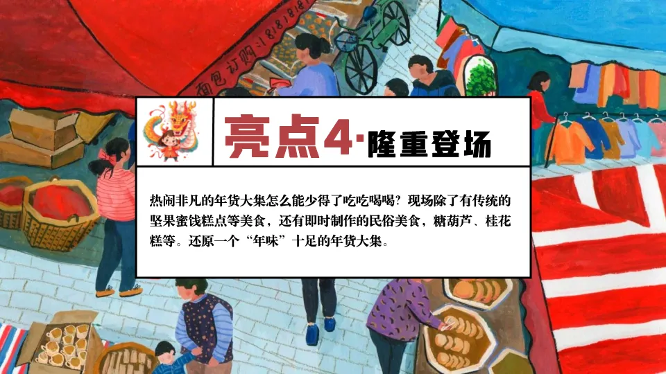 此外,现场还规划了新年上上签、祈福许愿、年味互动打卡(如老式爆米花、二八自行车场景)等主题区域,并辅以灯笼装饰、仿古摊位设计,全方位营造节日氛围。