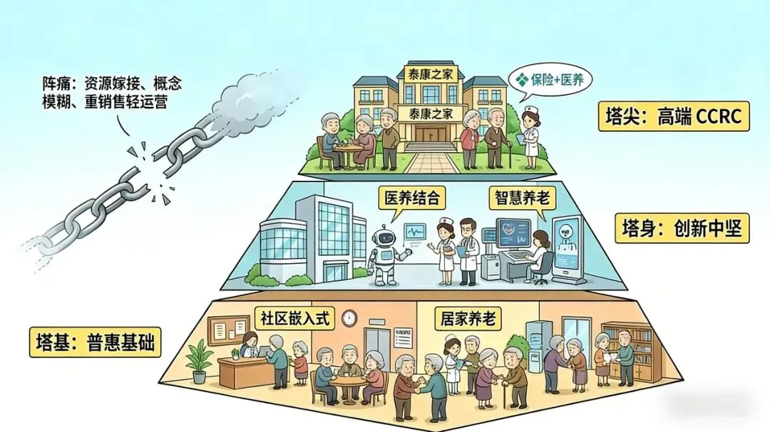 塔尖是由大型保险集团或实力房企主导的高端CCRC(持续照料退休社区),如泰康之家,凭借重资产投入和“保险+医养”闭环模式,为高净值人群提供了高品质养老选择,验证了清晰高端模式的可行性。