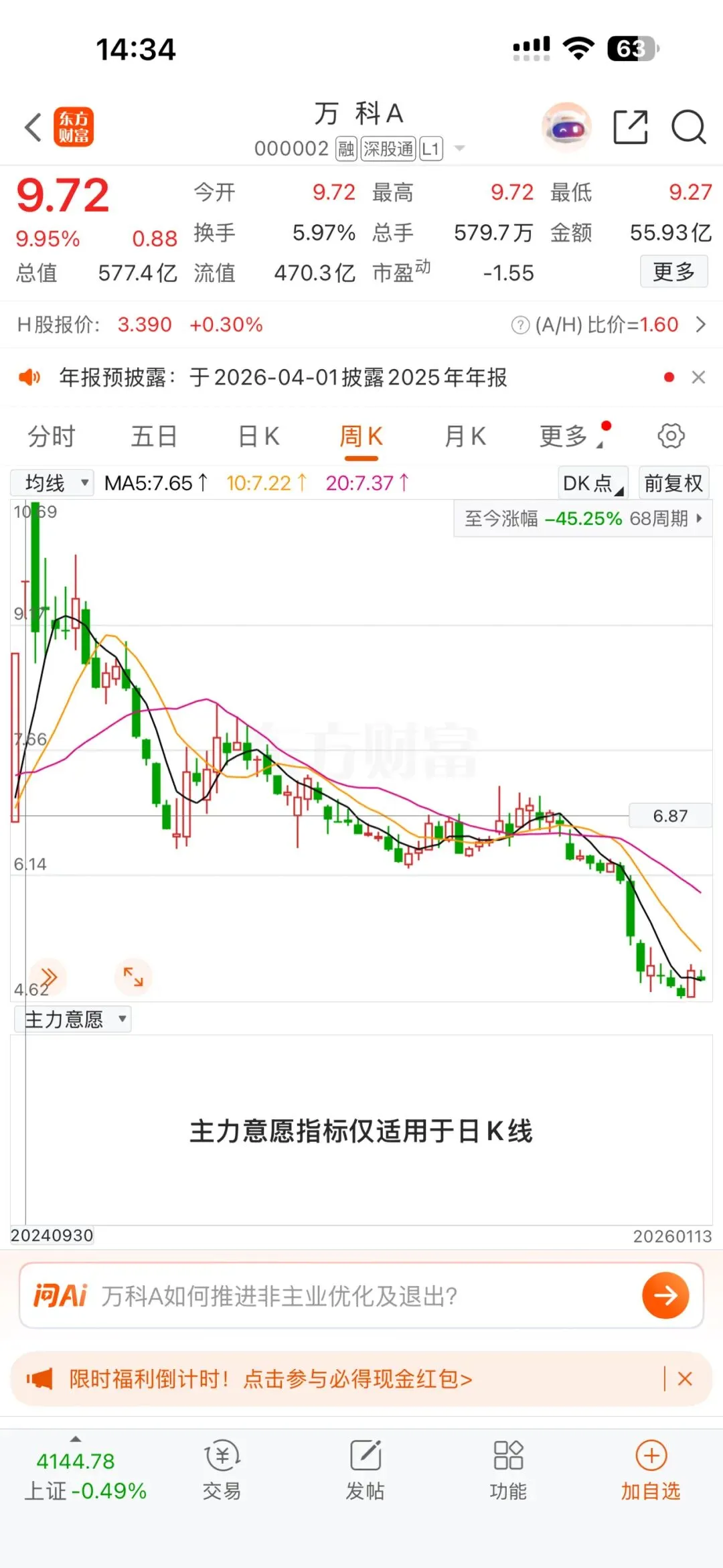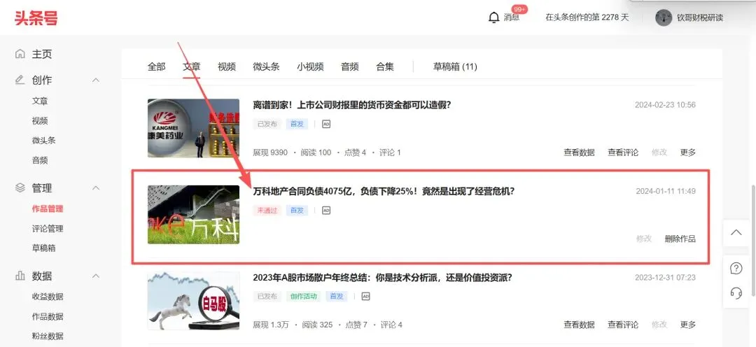 被强制下架的文章,一篇为《万科地产2023年全年销售预计3700多亿,预收房款才区区16亿》,在举报时已经删除。另一篇为《万科地产合同负债4075亿,负债下降25%!竟然是出现了经营危机?》,目前作为草稿还保存着。本次强制下架对博主想充当上市公司财务风险预警吹哨人角色的想法受到重大打击,也深刻体会到并非中国财经人员想当马后炮,而是目前国内舆论环境根据不具备危机吹哨人的生存条件。