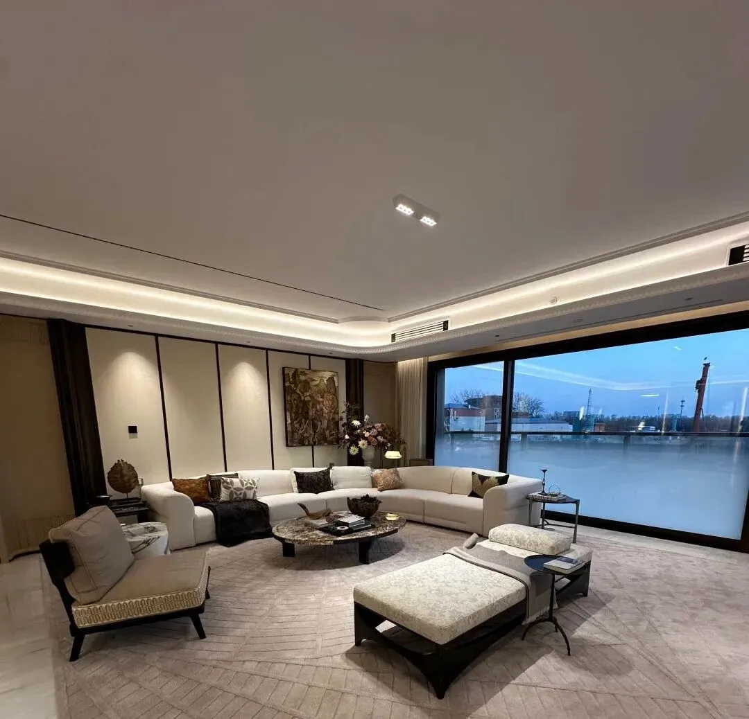 这周新开的样板间里客餐厅一体、尺度开阔,形成核心社交区;三面(近)采光,南向面宽大;动静分区清晰,主卧套房完整,私密性强;家政、储物、双卫配置齐全。