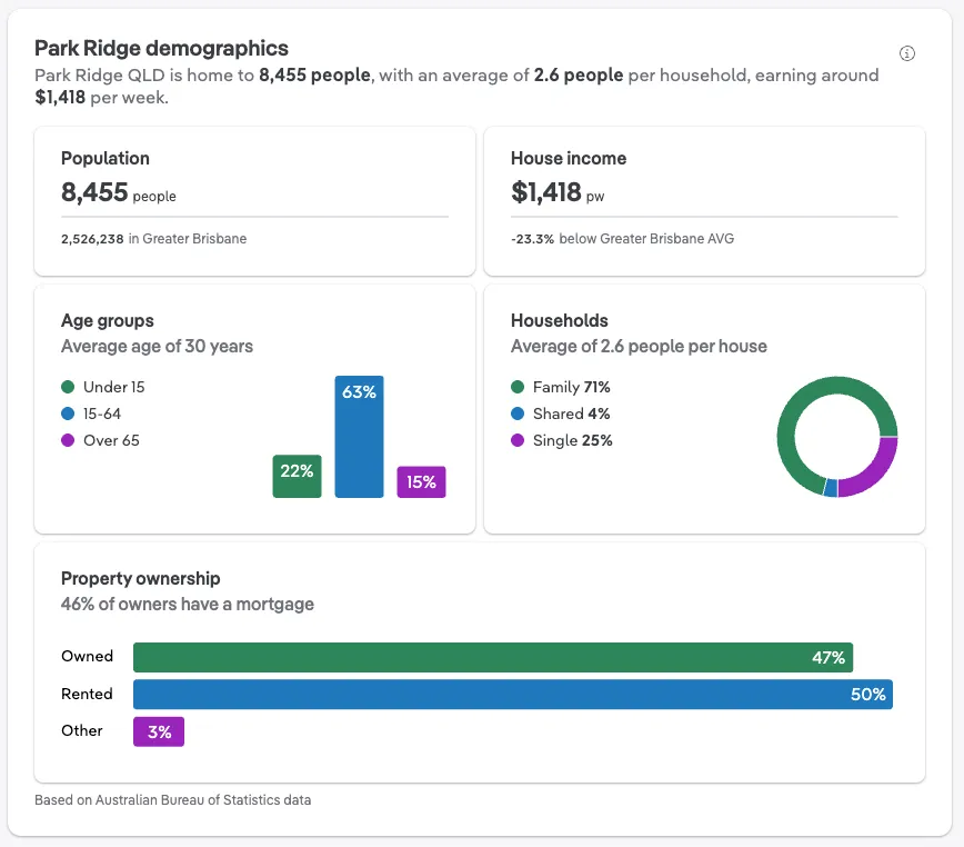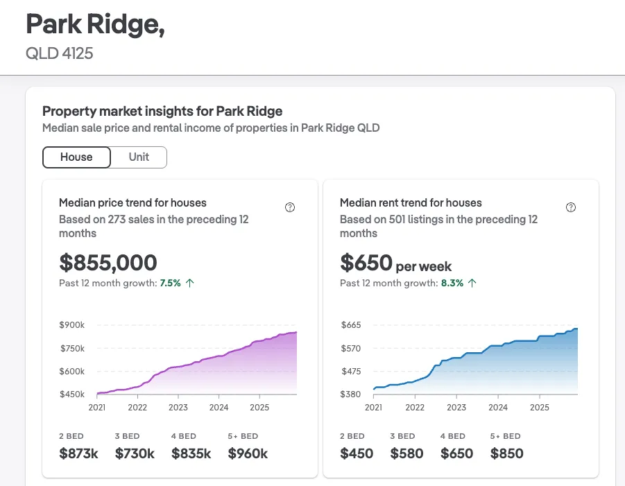 目前官方与市场数据显示,Park Ridge 房价仍然相对大布里斯班核心区域更“亲民”,且近几年呈现稳健增长: