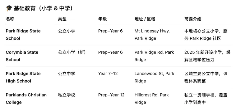 Park Ridge State School:公立小学,社区教育核心。