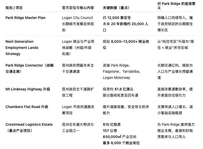 Park Ridge 的规划优势在于“三位一体”:明确的人口与住宅增长蓝图、持续兑现的交通基础设施,以及以 Crestmead Logistics Estate 为代表的大型就业引擎,使其从“城市外扩居住区”逐步升级为具备完整城市功能的增长型新城。
