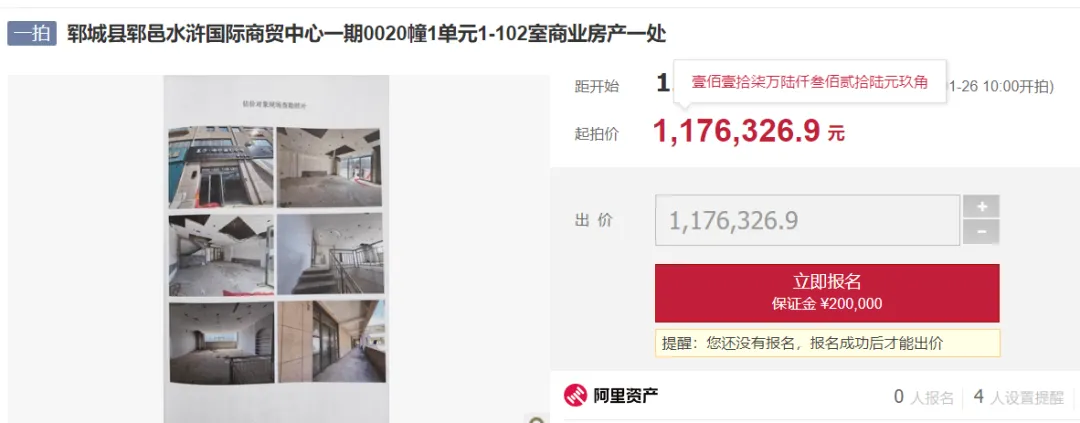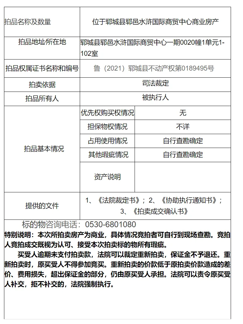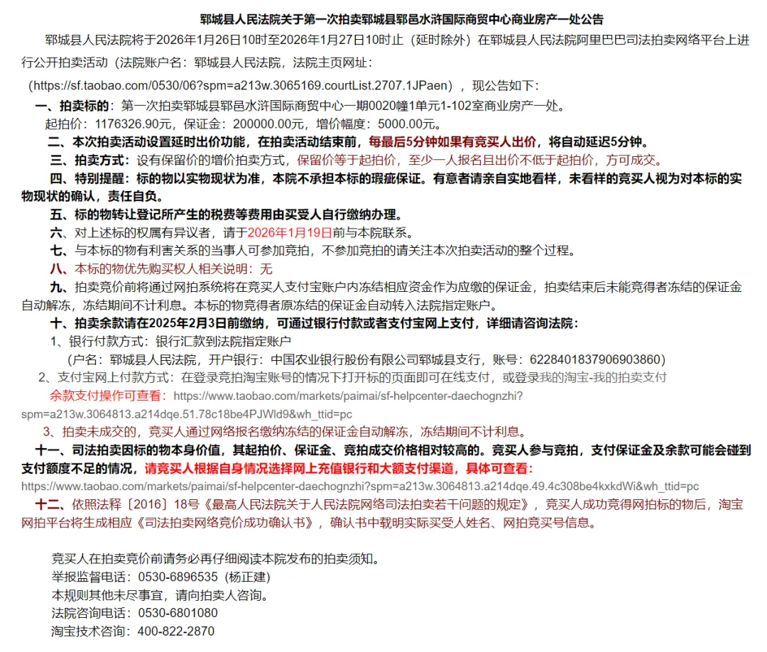 >郓城水浒商贸城一房产拍卖1176326.9 元!