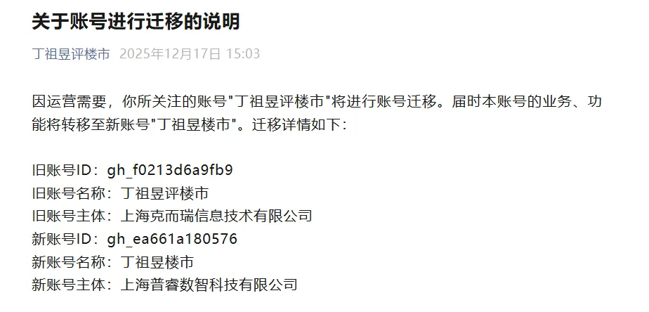 细心的行业粉丝就发现,他们长期关注的微信公众号“丁祖昱评楼市”,也已经完成了账号主体的变更。