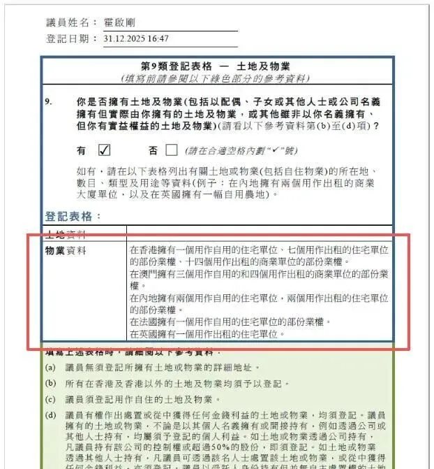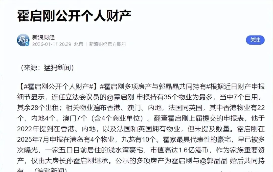最近香港立法会更新了议员们的财产申报,霍启刚这一份直接上了热搜。他名下有35套房产,这次全都清清楚楚列出来了,一个没藏。22套在香港,7套在澳门,内地4套都在大湾区城市,还有法国和英国各一套。其中28套是用来收租的,自己住的就7套,连浅水湾那套估值1.6亿港币的房子,都写着是跟郭晶晶婚后共同持有。