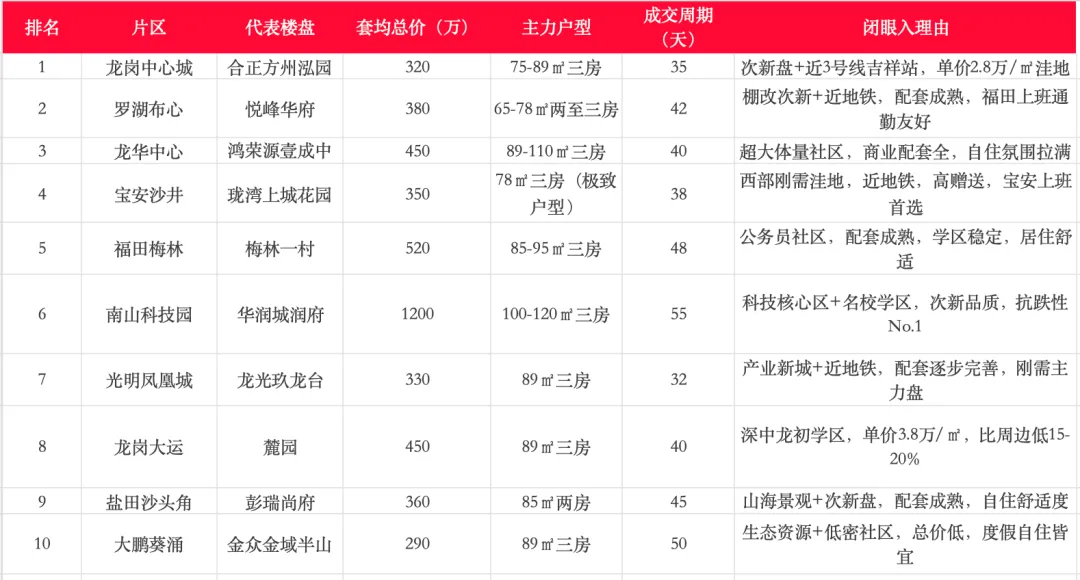 整理了2025年深圳二手房成交TOP10片区,每一个都是经过市场检验的“硬通货”,附详细参数,直接抄作业👇