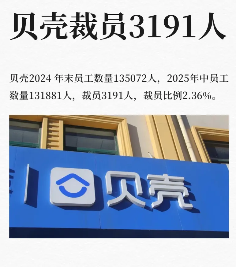 2025年末,房地产中介行业龙头贝壳找房再次陷入裁员风波。根据财报数据,贝壳2024年末员工数量为135072人,到2025年6月底降至131881人,半年时间裁员3191人,裁员比例达2.36%。这场规模空前的组织优化,折射出整个房地产行业深度调整期的阵痛。