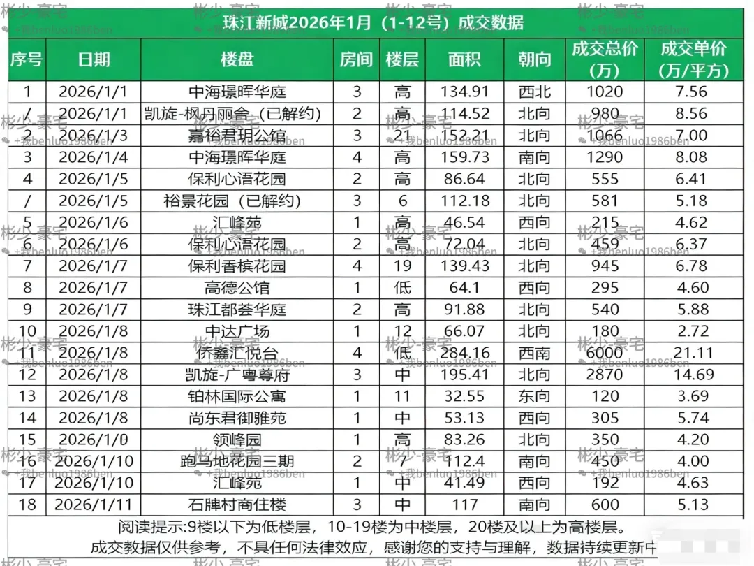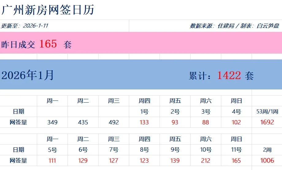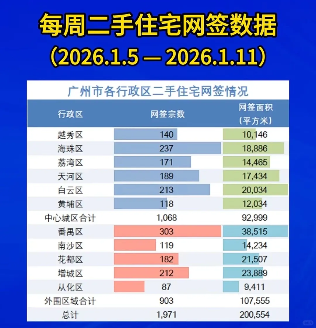 另一边的新房市场则凉意十足,全市网签仅 1006 套,环比下降 24.6%。主要原因是元旦假期备案滞后,加上新盘取证节奏放缓,购房者也在观望新年信贷政策,不少人把目光转向了即买即住的二手房。不过近郊高性价比项目仍有亮点,增城某 TOD 项目单周去化超 80 套,证明好产品依然有市场。