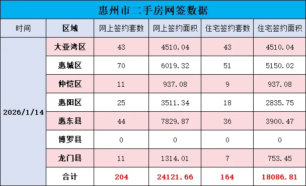 大亚湾区网签17套,面积1696.69㎡;惠城区25套,2335.05㎡;仲恺区135套,5007.56㎡;惠阳区44套,2889.53㎡;惠东县9套,603.01㎡;博罗县28套,9553.14㎡;龙门县3套,201.09㎡。合计261套,22286.07㎡。