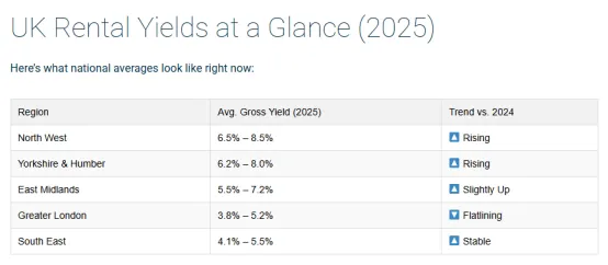 全国平均租金回报率约在6%–8%之间,不同区域差异明显,北部及中部地区表现领先,伦敦回报率最低,主要受高房价推高导致回报被摊薄影响。
