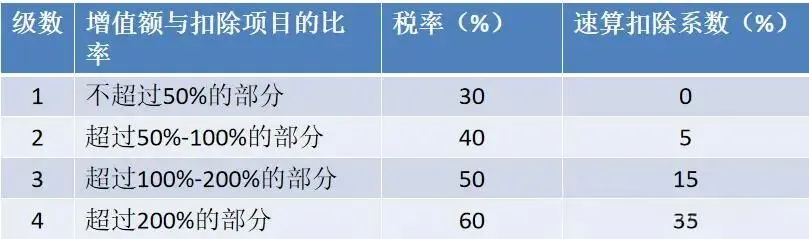 1.2.5.2增值额、适用税率及速算扣除系数 1.增值额=除税销售收入-可扣除项目总计金额;2.适用税率及速算扣除系数: