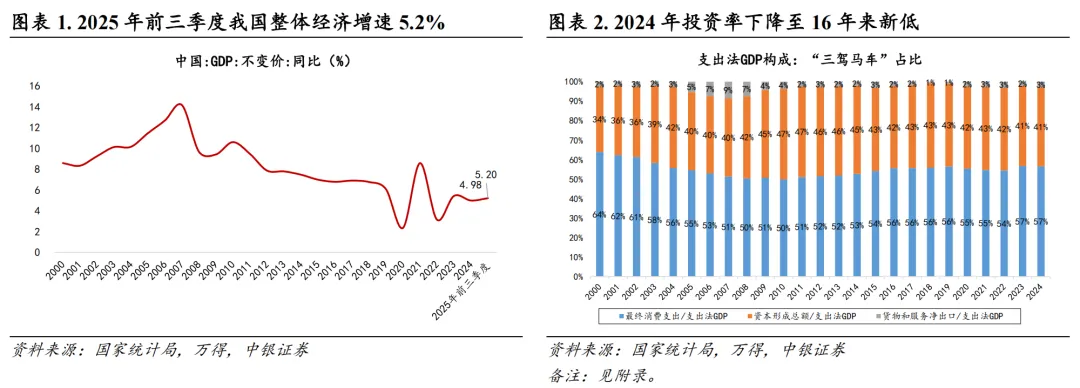 中国经济目前正在经历转型阵痛期,2024年投资率下降至16年来新低。2025年前三季度整体经济增速5.2%。支出法GDP构成的“三驾马车”当中,受房地产投资持续下行的影响,整体投资缩减明显,投资率(资本形成总额占支出法国内生产总值的比重)持续下滑,2024年为41%,降至16年以来(2008年以来)的新低。