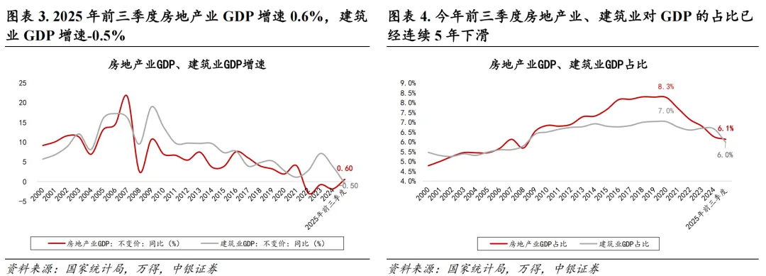 此外,房地产上游的建筑业GDP增速-0.5%,房地产业、建筑业增速远低于其他行业,两者占GDP的比重已经连续5年下滑,从2019年的15.32%下降至2025年前三季度的12.11%,房地产业的下滑速度更快,从2018年峰值的8.29%下降至2025年前三季度的6.13%。