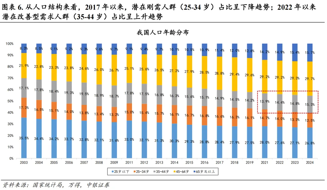 从人口结构上看,人口老龄化趋势明显,2024年65岁以上人口占比达15.7%,呈现逐年升高的趋势。不过,我们也同时注意到了,2022年以来35-44岁人口占比呈上升趋势,2024年达15.3%,这部分人口是潜在主力改善型购房需求人群;从2017年以来,潜在刚需人群(25-34岁)占比呈下降趋势,2024年降至12.5%。整体市场成交结构与人口结构基本匹配。