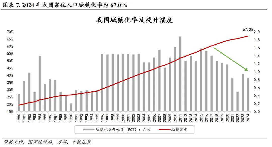 2024年我国常住人口城镇化率为67.0%,虽然仍然呈上升趋势,但整体提升幅度明显下滑,逐步进入“平台期”。