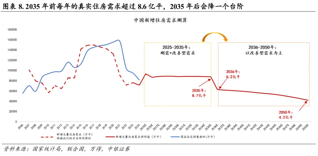 根据我们的测算,2025-2027年三年平均每年的真实需求还有8.9亿平。从长期需求来看,2035年前每年的真实住房需求超8.6亿平(改善占比约6成),2035年后会降一个台阶,但仍超过4.1亿平/年,增长引擎将会基本转为改善型需求。