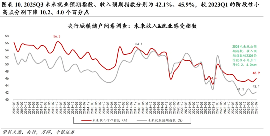 根据央行城镇储户季度问卷调查,2025Q3当期就业、收入感受指数分别为25.8%、46.5%,较2023Q1的阶段性小高点分别下降14.1、4.2个百分点,其中当期就业感受指数处于2010年以来最低水平。