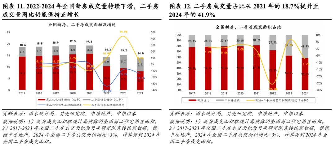 我们首先从全国数据来看,新房销售持续走弱,二手房在“以价换量”的带动下尚能维持成交规模。2024年新房+二手房整体成交面积14亿平,同比下降7.7%,主要是受制于新房销量的拖累。2022-2024年全国新房成交量持续下滑,2024年仅8.1亿平。