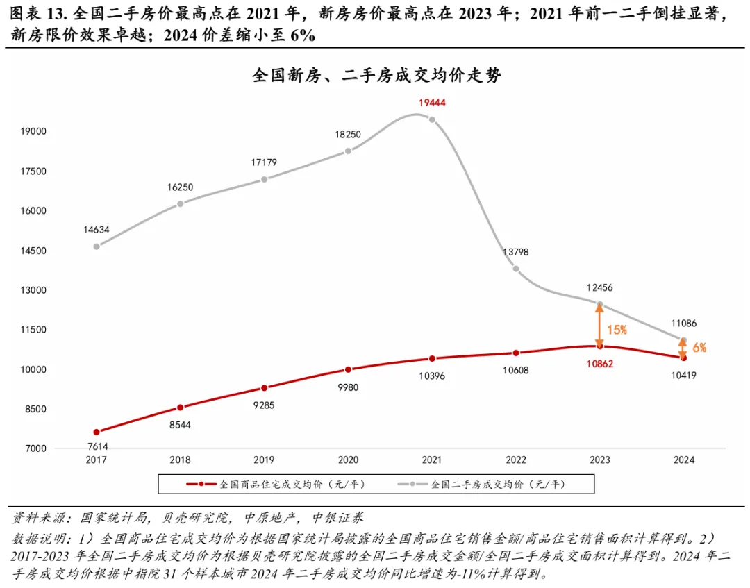 从成交价来看,全国二手房价最高点在2021年,新房房价最高点在2023年;2021年前一、二手倒挂显著,新房限价效果卓越;2024年价差缩小至6%。全国二手房房价在2021年达到最高点19444元/平,新房房价在2023年达到最高点10862元/平,在全国层面一、二手始终存在倒挂现象,此前房地产上行时期,新房限价效果较好,2021年及之前一、二手房价差较大,自2022年开始倒挂幅度不断缩小,2024年一、二手的倒挂幅度仅6%。部分城市的一手房价格已经远超二手房。