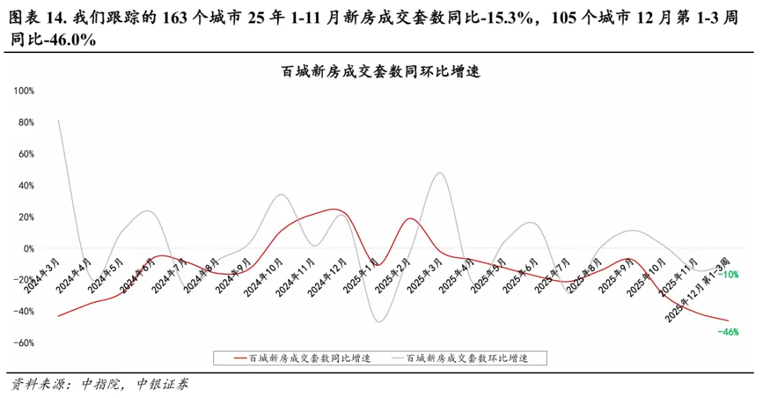 1)市场成交量价持续下行。百城25年1-11月新房成交套数同比-15%,12月1-3周降幅进一步扩大至46%。70城新房、二手房房价已经分别连续30、31个月下滑。