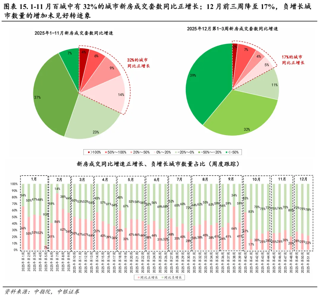 从成交量同比正增长的城市数量来看,1-11月百城中有32%的城市新房成交套数同比正增长;12月前三周降至17%,负增长城市数量的增加未见好转迹象。