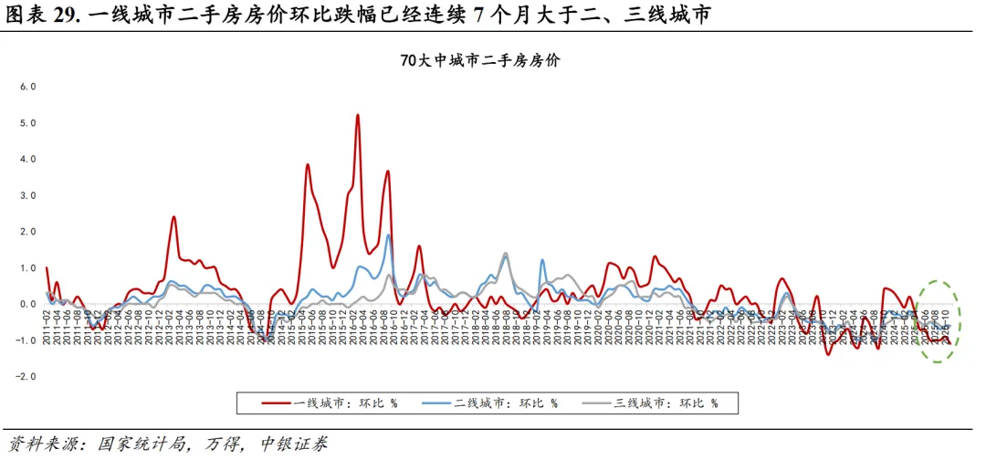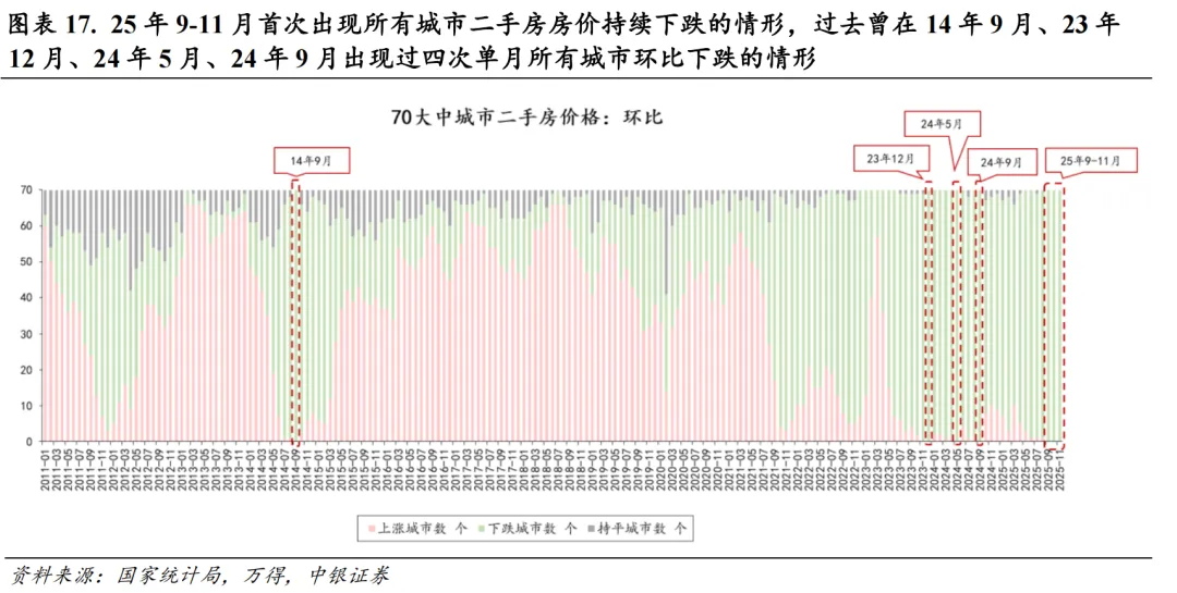 而从二手房环比下跌的城市数量来看,2025年9-11月首次出现所有城市二手房房价持续下跌的情形。过去曾在2014年9月、2023年12月、2024年5月、2024年9月出现过四次单月所有70城二手房房价环比下跌的情形,但此次连续三个月所有城市二手房房价环比均下跌是自有2011年数据统计以来首次出现的情形。