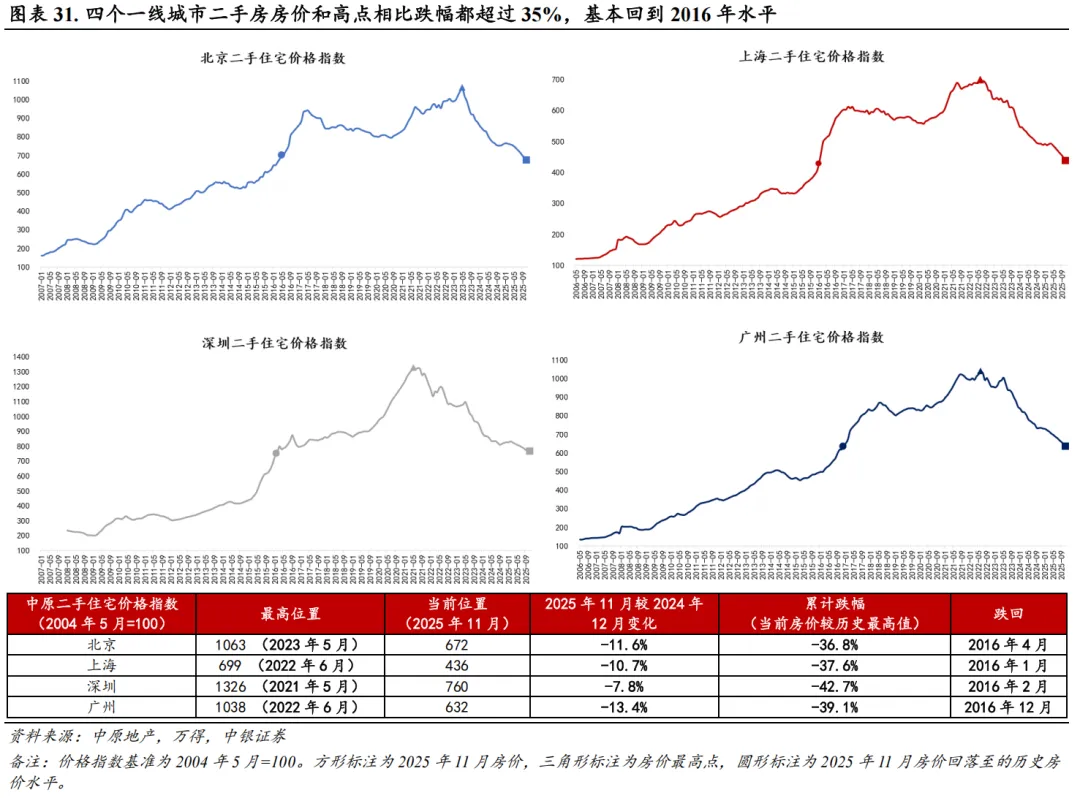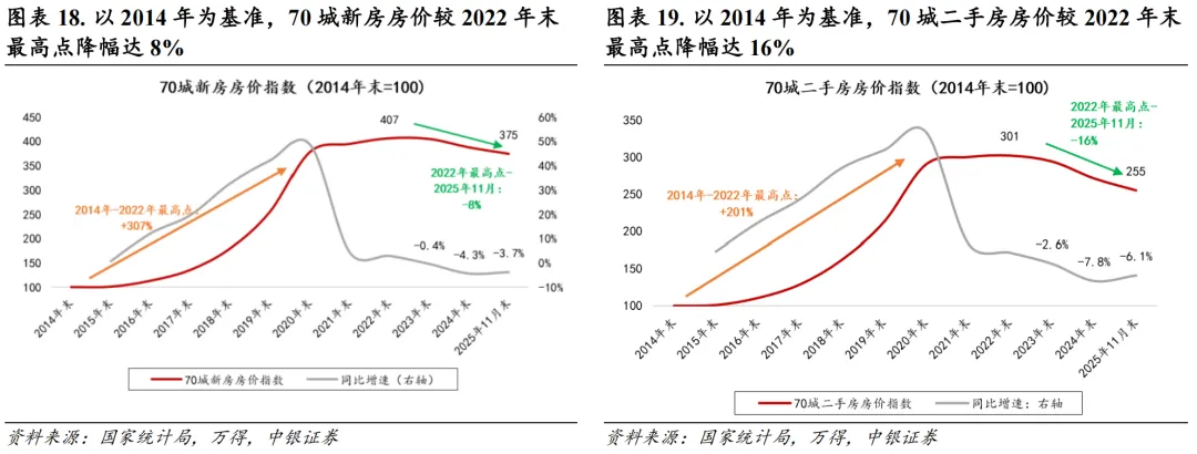 我们以2014年为基准,70城新房、二手房房价均在2022年末达到最高点,而从最高点到2025年11月的降幅分别为8%、16%。微观跌幅将更加显著。