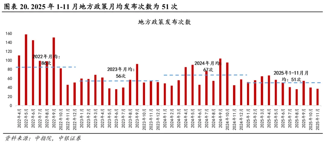 从2022年至今地方政策不断出台,但2025年以来,各地政策出台频次有所放缓、力度减弱,月均出台51条,低于2024年月均(67条)、2023年月均(56条)、2022年月均(86条)。