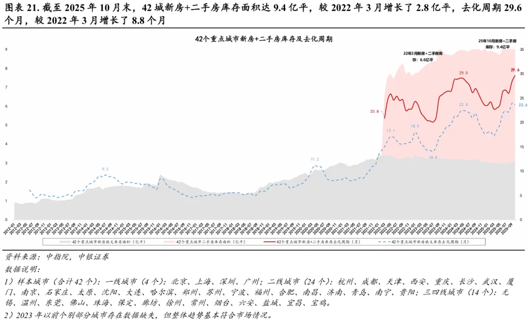 3)库存持续走高,库存上涨大于消化能力,二手房库存不断挤压新房。25年10月末42城新房+二手房库存面积9.4亿平(68%是二手房库存),去化周期29.6个月。