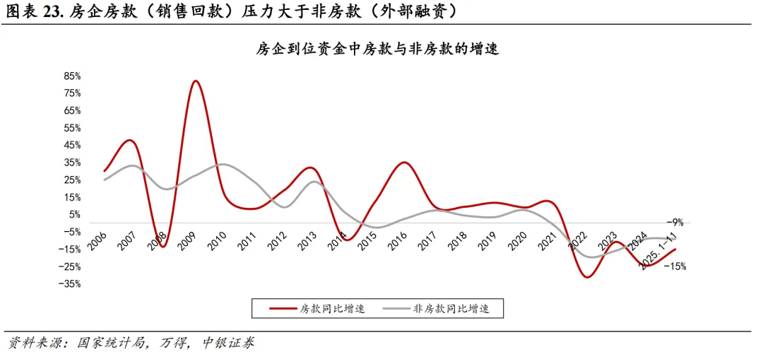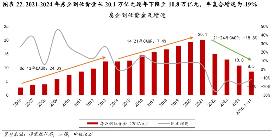 4)房企资金持续紧张。21-24年房企到位资金从20.1降至10.8万亿元,CAGR-19%,房款-23%,非房款-15%。