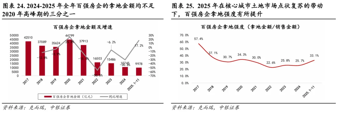 5)房企拿地能力与意愿均走弱。24、25年百强房企拿地金额不足20年高峰期的三分之一。
