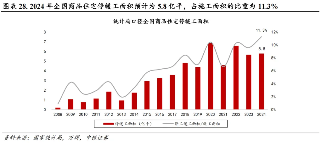 6)停缓工面积占比提升,保交楼压力仍在。我们预计24年全国商品住宅停缓工面积5.8亿平,占施工面积的比重为11.3%。