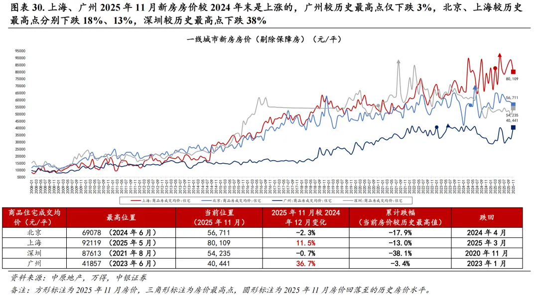 从中原地产一线城市房价数据来看,上海、广州当前新房房价较2024年末上涨;二手房房价和高点相比跌幅都超过35%,基本回到2016年水平。