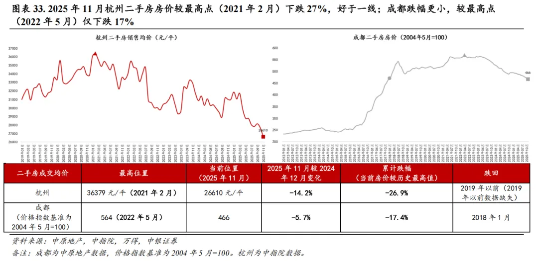 2)二手房价:2025年11月杭州二手房房价较最高点(2021年2月)下跌27%,好于一线;成都跌幅更小,较最高点(2022年5月)仅下跌17%,成都二手房房价较最高点的跌幅是小于新房房价的。