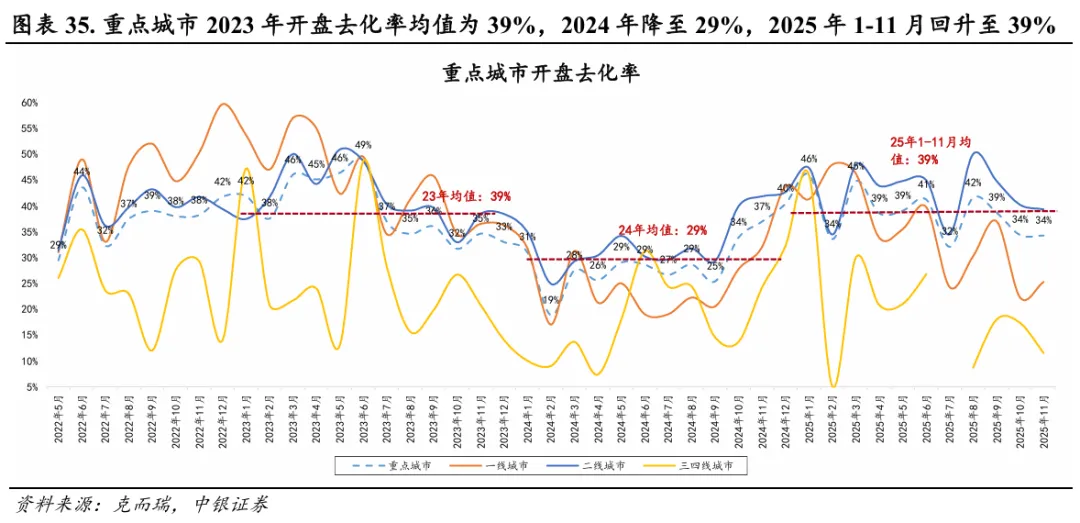 3.2 开盘去化率分化:自25年开始,一线城市开盘去化率明显下滑,二线稳定,三四线拖累显著,整体好于24年全年平均