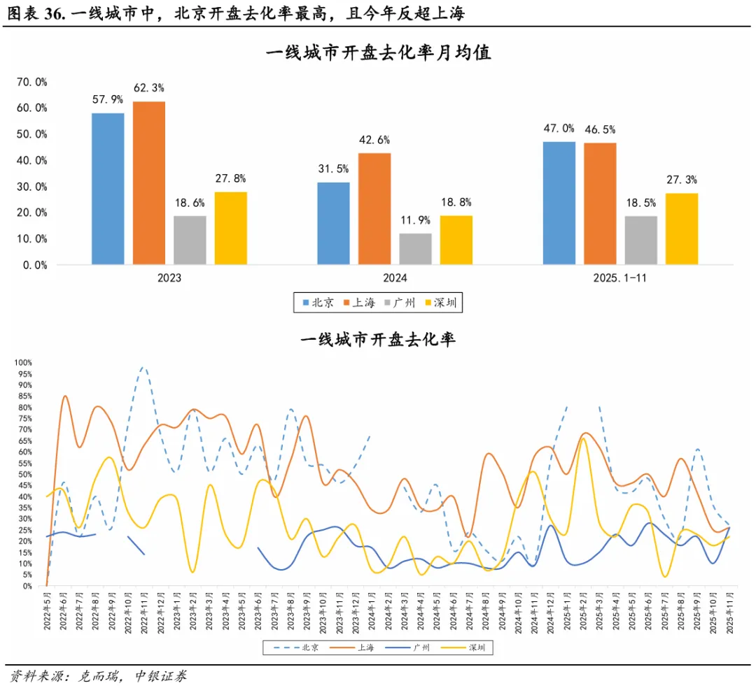 从微观层面看开盘去化率,自2025年开始,一线城市开盘去化率明显下滑,二线稳定,三四线拖累显著,整体好于2024年全年平均。根据克而瑞,重点城市2023年开盘去化率均值为39%,2024年降至29%,2025年1-11月回升至39%。但是,一线城市开盘去化率从2025年一季度的45%快速下滑至11月的25%,二线城市从2025年一季度的43%小幅下滑至11月的39%,三四线城市2025年11月的去化率仅12%。具体来看,一线城市中,北京开盘去化率最高,且今年反超上海。