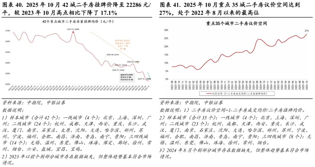3)二手房挂牌价格持续下滑,且议价空间明显提升。25年10月42城二手房挂牌价较最高点下降17%,议价空间达到27%,市场供需预期不匹配改变了买卖双方的心理预期,双方价格博弈加剧。