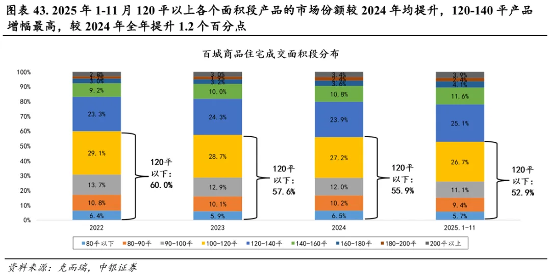 5)需求结构从“刚需”转为“改善”,考虑因素变复杂,决策时间拉长。25年1-11月120平以上面积段产品成交占比提升至47%。相比刚需,改善型需求“可买可不买”的特征突出,购房决策更容易受到收入预期和市场前景判断的影响。