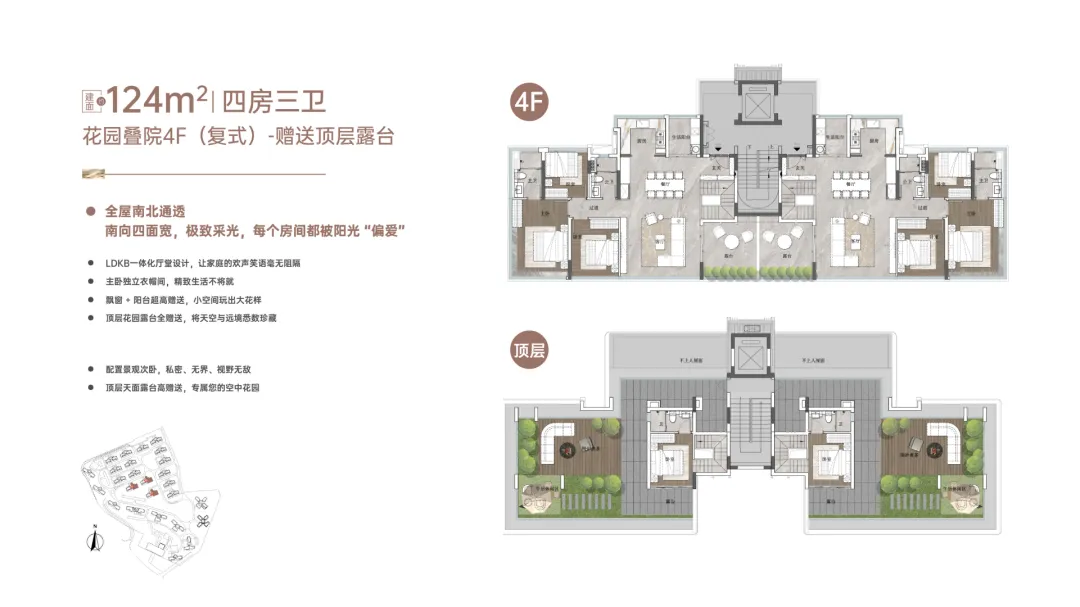 “玥境”为滨江小洋楼,主打112-130㎡低密叠院,最大亮点是超高赠送率,1F、2F户型赠送私属花园,3F赠送超大景观露台,4F复式设计,赠送顶层天台。