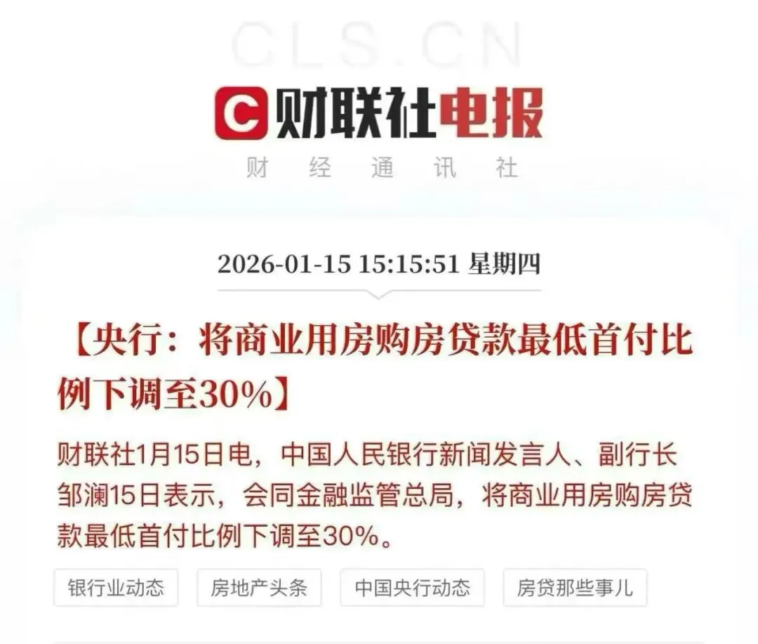 今天下午,中国人民银行新闻发言人、副行长邹澜正式宣布,经会同金融监管总局,全国商业用房购房贷款的最低首付比例统一调整至30%。