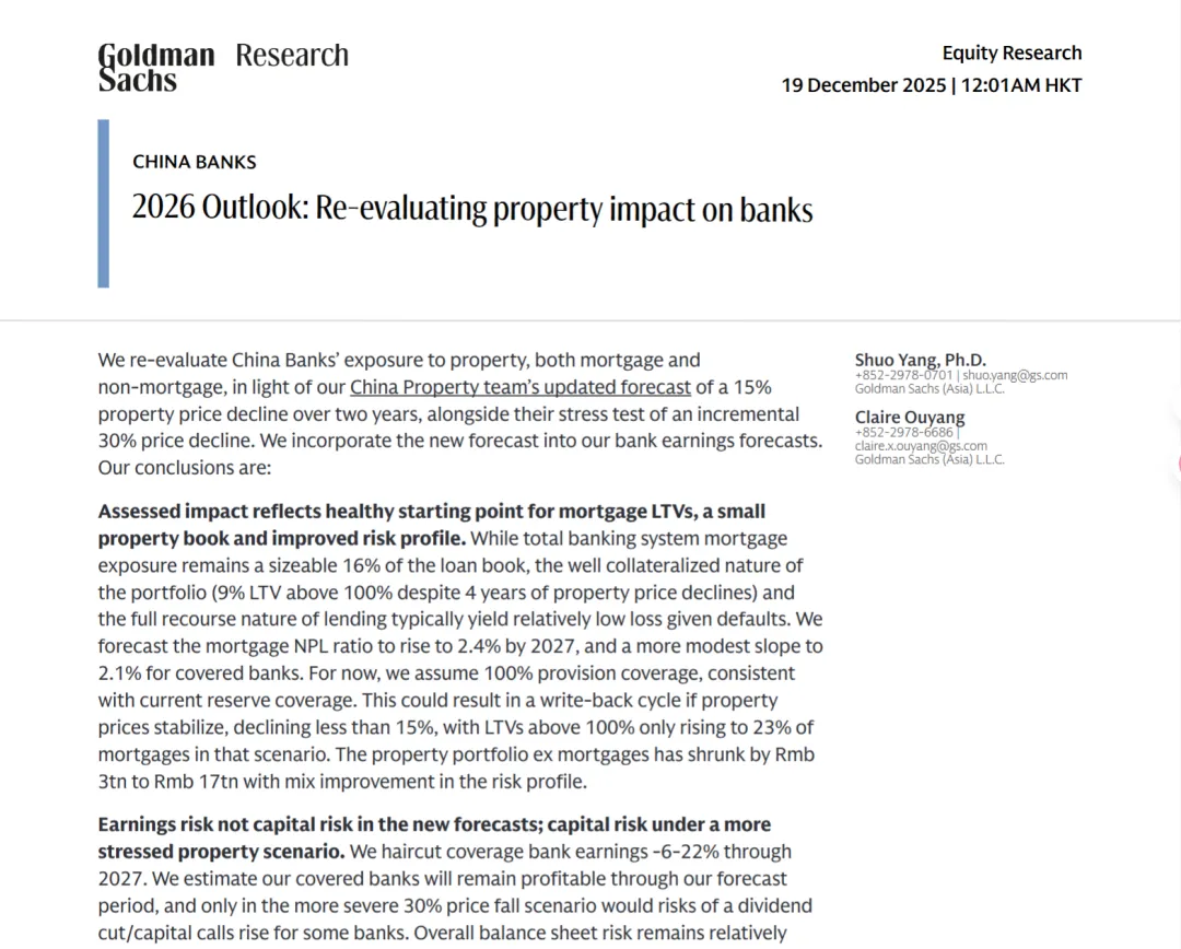 你以为地产下行会压垮中国银行业?高盛2025年12月19日发布的《2026 Outlook:Re-evaluating property impact on banks》研报,直接颠覆认知——地产冲击可控,银行盈利虽承压但资本无虞,4-5%股息率更是估值“压舱石”,2026年H/A股平均总回报可达9%/11%!